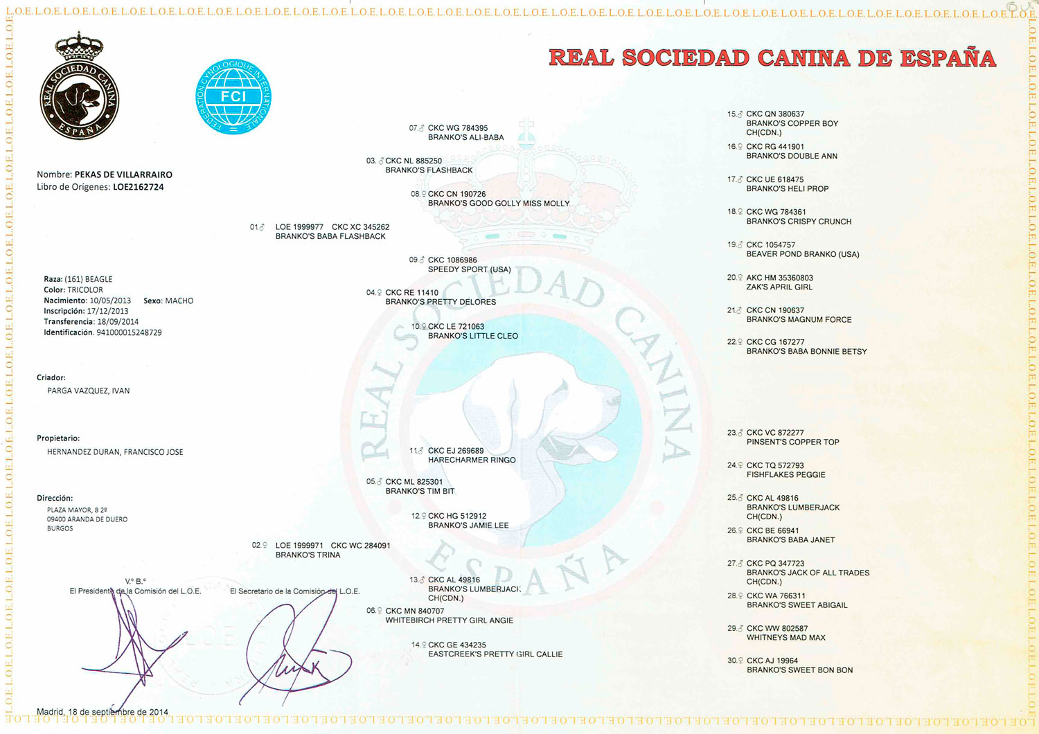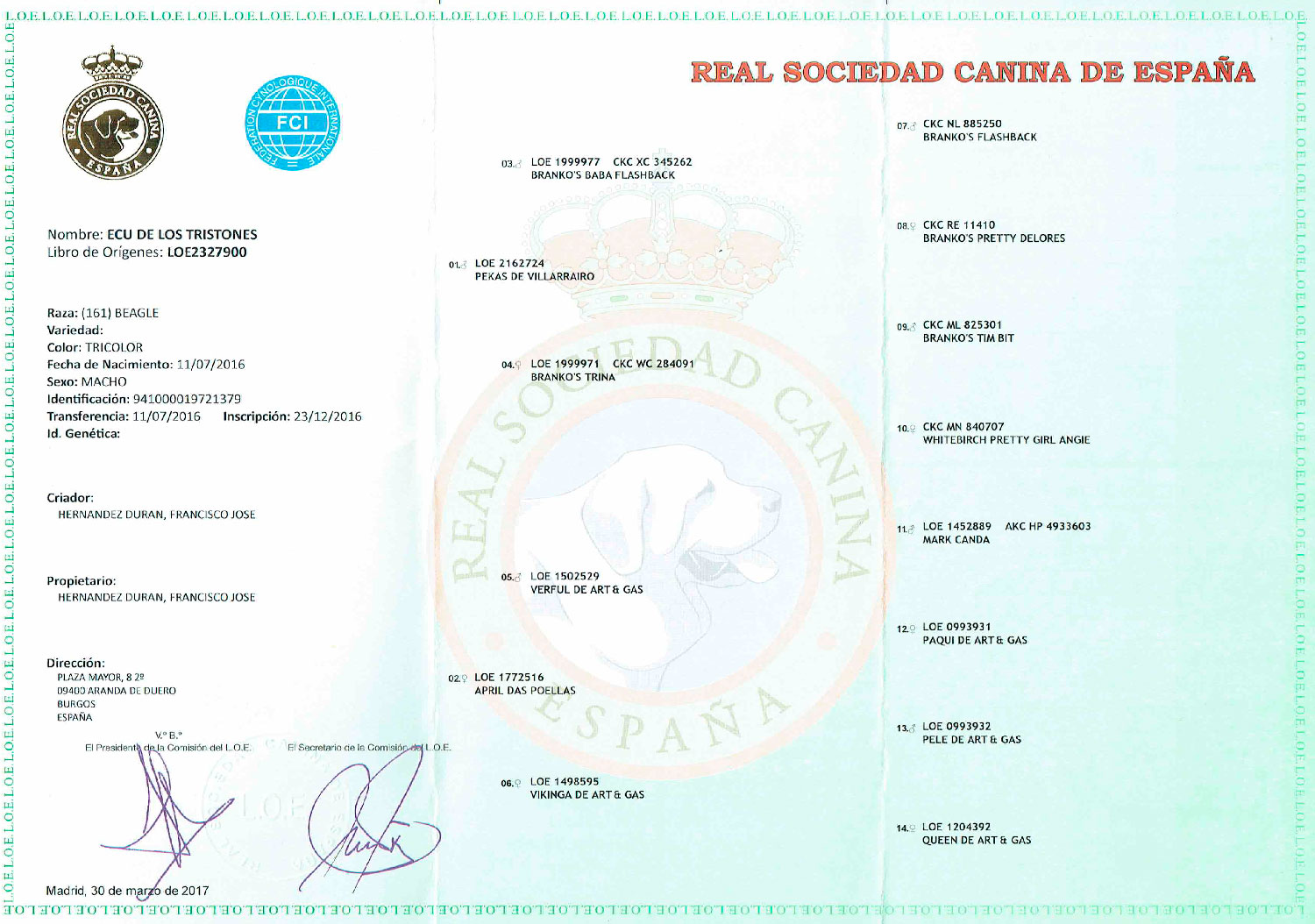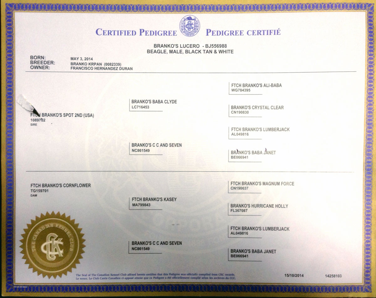 • Este perro fue elegido personalmente por Frieda Krpan de entre toda la camada. Tiene una voz excelente, muy cariñoso y va progresando cada día de caza. Su madre y su padre son campeones de trabajo, como puede verse en el pedigree, siendo estos unos de los mejores reproductores que tiene Branko.